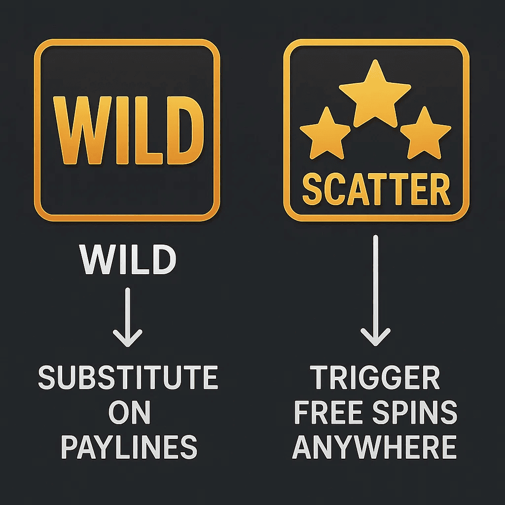 U većini slot igara, obični simboli isplaćuju dobitak samo kada se poravnaju na isplatnim linijama. Wild i scatter simboli su različiti: oni mijenjaju način na koji se formiraju dobitci i kako se aktiviraju značajke. Wild simboli obično pomažu u dovršavanju dobitnih kombinacija, dok scatter simboli često otključavaju besplatne vrtnje ili bonus runde čak i ako se ne pojave na određenoj liniji.